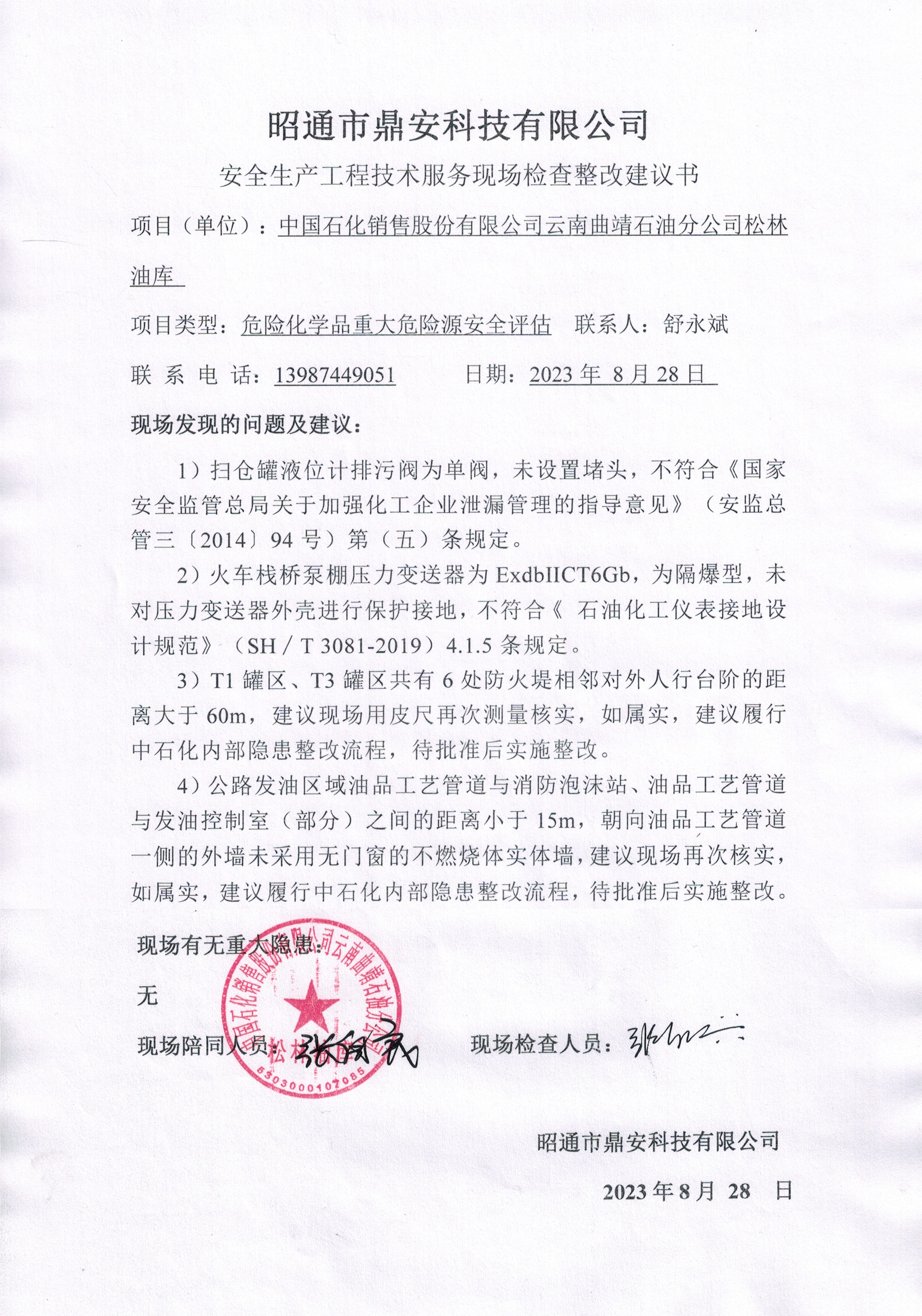項(xiàng)目名稱 | 中國(guó)石化銷售股份有限公司云南曲靖石油分公司松林油庫(kù)危險(xiǎn)化學(xué)品重大危險(xiǎn)源安全評(píng)估報(bào)告 | 合同編號(hào) | DAAPQJ2023-35 | |||||