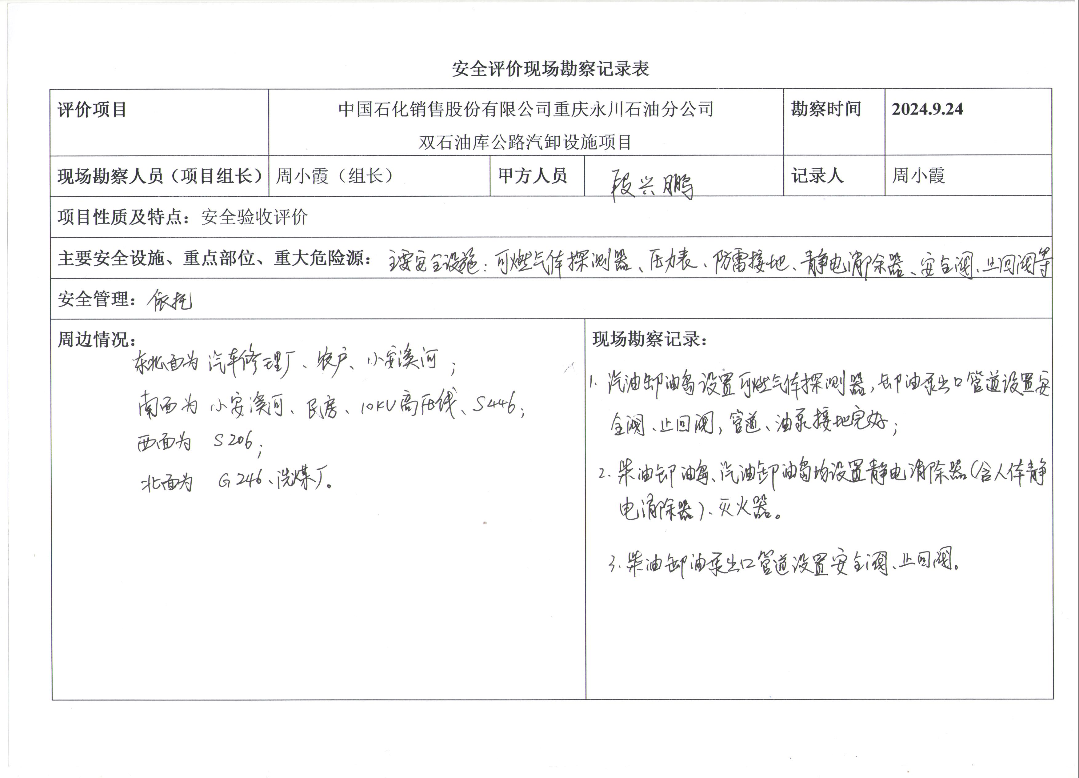 現(xiàn)場勘查情況 | 公路汽卸設施(柴油卸油島、汽油卸油島)安全設施和安全管理符合安全生產條件。 | |||||||