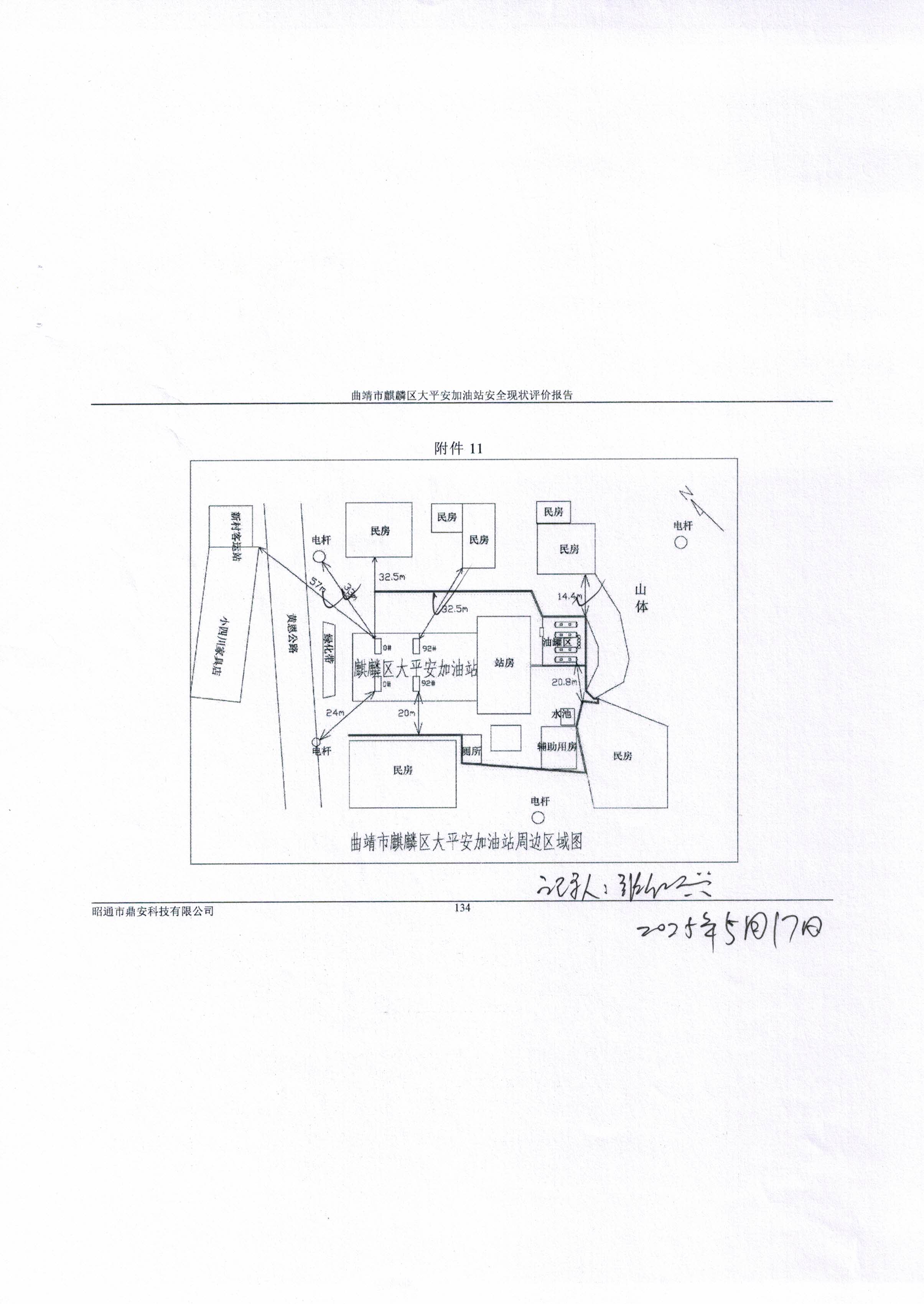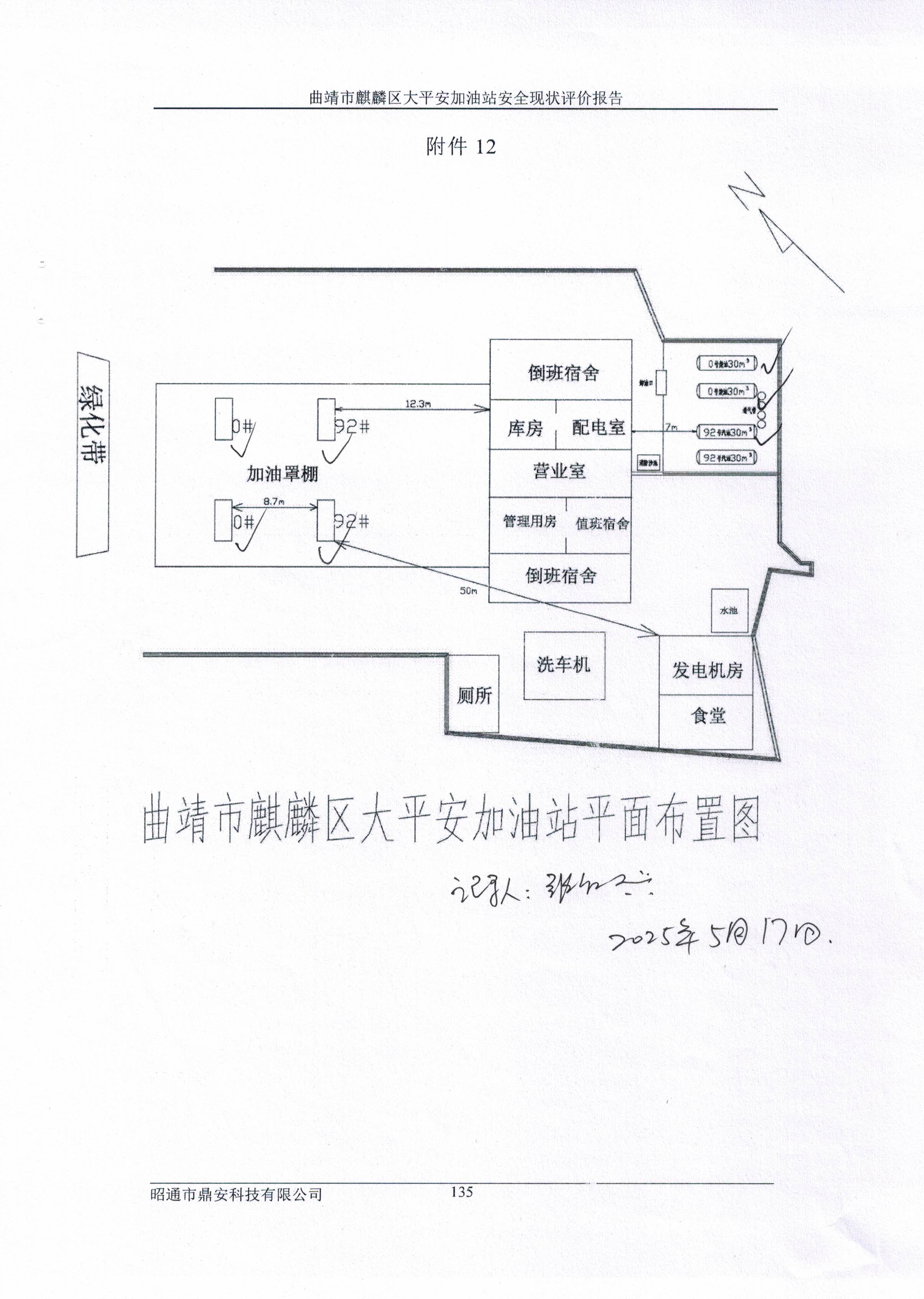 評價結(jié)論為:曲靖市麒麟?yún)^(qū)大平安加油站已完成本次評價發(fā)現(xiàn)的不符合項整改,站址選擇及平面布置、加油工藝及設(shè)施、消防設(shè)施、電氣及報警系統(tǒng)、建(構(gòu))筑物等方面符合《汽車加油加氣加氫站技術(shù)標準》(GB50156-2021)、《加油站作業(yè)安全規(guī)范》(AQ3010-2022)標準規(guī)定;經(jīng)營場所、危險化學品儲存設(shè)施、人員配置及培訓考核、安全管理制度、安全操作規(guī)程、應急預案、應急物資滿足《危險化學品安全管理條例》(國務(wù)院令第591號,第645號修改)第三十四條、《危險化學品經(jīng)營許可證管理辦法》(原國家安監(jiān)總局令第55號公布,第79號修正)第六條要求,從安全的角度曲靖市麒麟?yún)^(qū)大平安加油站具備危險化學品經(jīng)營的安全條件。 | ||||||||