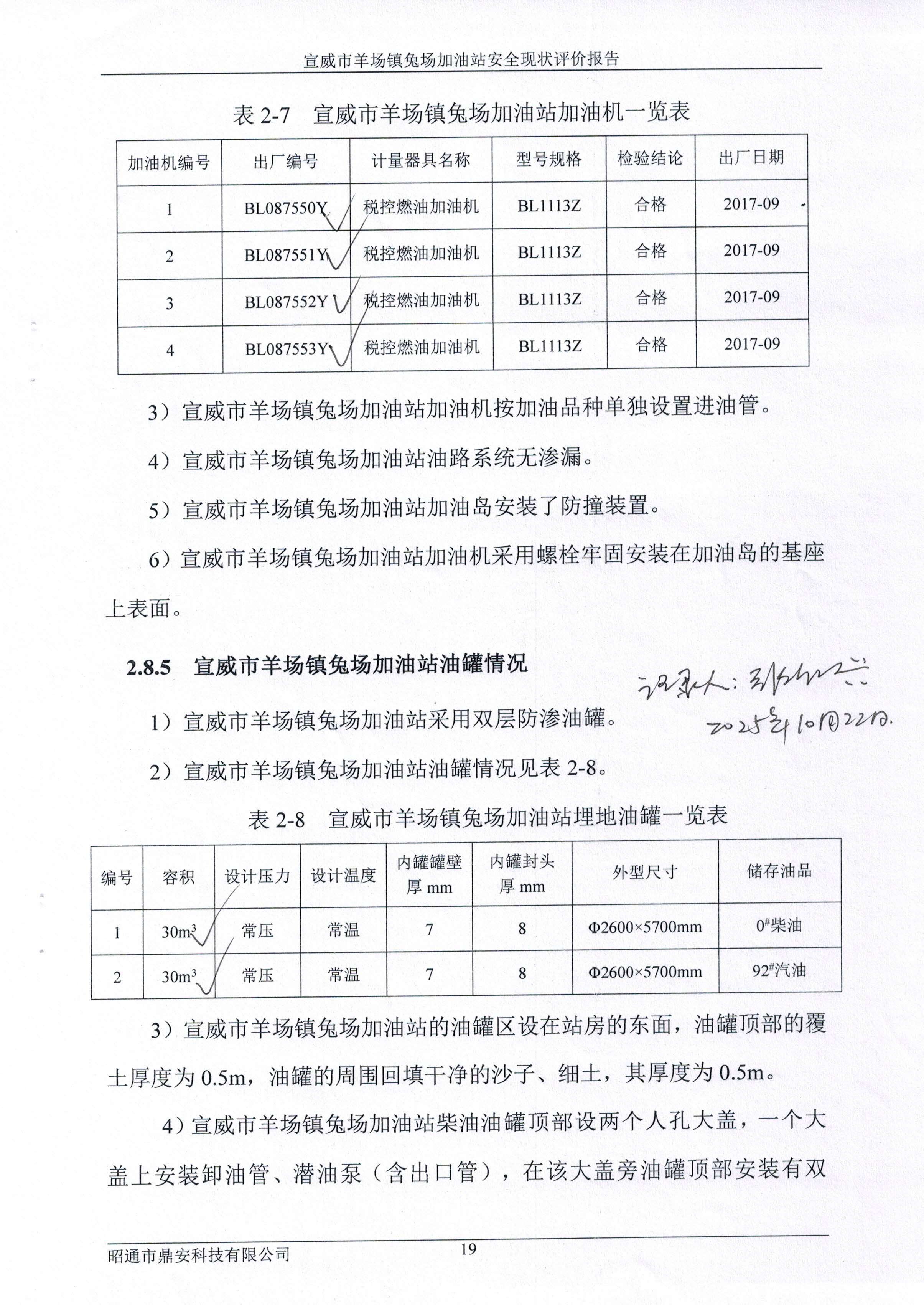 評價結論為:宣威市羊場鎮(zhèn)兔場加油站已完成本次評價發(fā)現(xiàn)的不符合項整改,站址選擇及平面布置、加油工藝及設施、消防設施、電氣及報警系統(tǒng)、建(構)筑物等方面符合《汽車加油加氣加氫站技術標準》(GB50156-2021)、《加油站作業(yè)安全規(guī)范》(AQ3010-2022)標準規(guī)定;經(jīng)營場所、危險化學品儲存設施、人員配置及培訓考核、安全管理制度、安全操作規(guī)程、應急預案、應急物資滿足《危險化學品安全管理條例》(國務院令第591號,第645號修改)第三十四條、《危險化學品經(jīng)營許可證管理辦法》(原國家安監(jiān)總局令第55號公布,第79號修正)第六條要求,從安全的角度宣威市羊場鎮(zhèn)兔場加油站具備危險化學品經(jīng)營的安全條件。 | ||||||||
