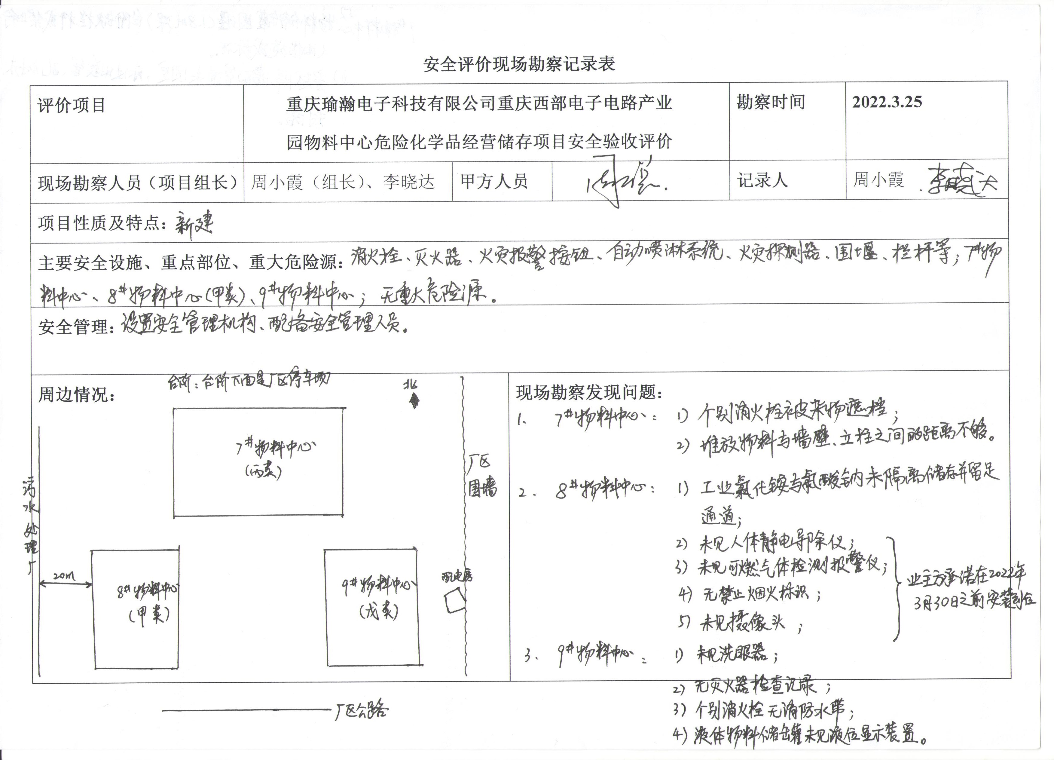 項目名稱 | 重慶瑜瀚電子科技有限公司物料中心危險化學品經(jīng)營儲存項目 安全驗收評價 | 合同編號 | DA-(渝)JP-2022001 | |||||