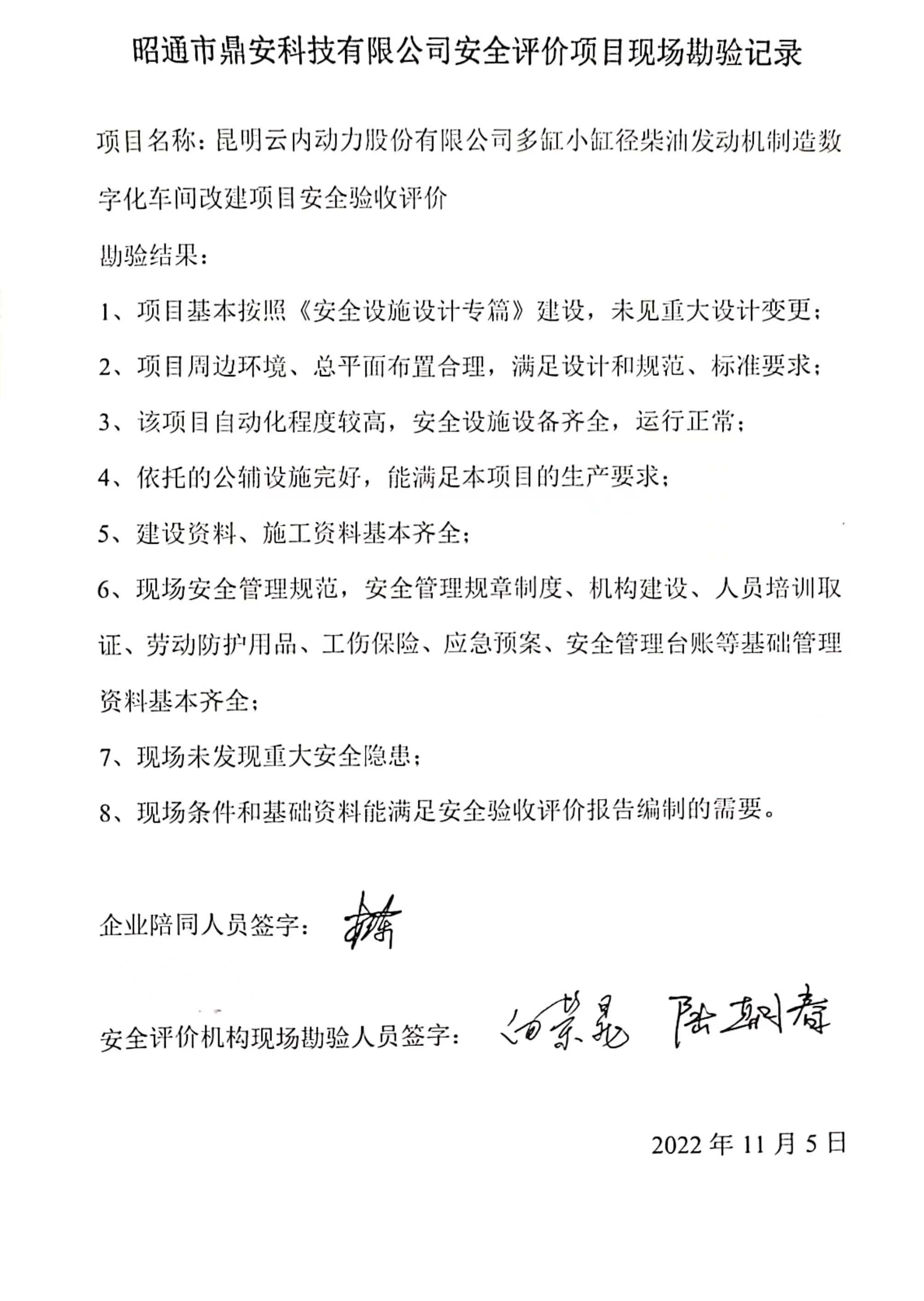 評價項目評價結(jié)論: 昆明云內(nèi)動力股份有限公司多缸小缸徑柴油發(fā)動機(jī)制造數(shù)字化車間改建項目符合國家有關(guān)安全方面的法律、法規(guī)、標(biāo)準(zhǔn)、規(guī)程、規(guī)章的有關(guān)要求,本項目安全設(shè)施設(shè)計的規(guī)定得到貫徹和落實,具備安全驗收條件。 | ||||||||